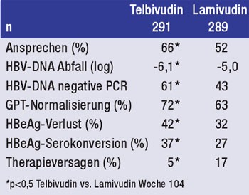 Zu Telbivudin wurden insgesamt neun Arbeiten präsentiert, unter anderem die 2-Jahres-Daten der GLOBE-Studie. In dieser Untersuchung wurden 1.367 Patienten (921 HBeAg+ und 446 HBeAg-) mit Telbivudin bzw. Lamivudin behandelt. Nach 104 Wochen war Telbivudin bei den HBeAg-positiven Patienten mit Erhöhung der GPT >2x ULN (n=580) Lamivudin signifikant überlegen im Hinblick auf Therapieansprechen und antiviraler Wirksamkeit (Virus-last-Reduktion, PCR-Negativität, Resistenz und primäres Therapieversagen). Zudem kam es bei signifikant mehr Patienten zur HBeAg-Serokonversion und GPT-Normalisierung (Tab. 2) (Rasenack J et al. #513).