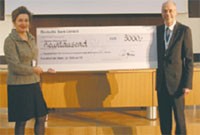Herr Christian Kröger, Roche Pharma AG, überreicht Dr. Mechthild Vocks-Hauck einen Scheck für