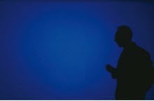 Jarmans Silhouette – das Plakat zu „Blue“ (© Courtesy Basilisk Communications)1986 erkrankte Derek Jarman an Aids – die Krankheit sowie die Medikamente, die er erhielt, führten zu einer Netzhautablösung und schließlich zur völligen Erblindung. Sein letzter Film „Blue“ (1993) visualisiert für den Betrachter in radikaler Weise seine krankheitsbedingte Sehstörung, denn er zeigt 74 Minuten lang eine rein blaue Leinwand. Zu hören ist eine Textcollage von Erinnerungen aus Jarmans Kindheit, Tagebucheinträgen, poetischen Äußerungen, politischen Statements, Nachrufen auf gestorbene Freunde, Krankheitsberichten – und Bemerkungen zur Farbe Blau, gelesen von Jarman selbst sowie von mit ihm befreundeten Schauspielern. Musikalisch ergänzt von Geräuschen, Soundeffekten und der Musik seines langjährigen Filmkomponisten Simon Fisher-Turner. Zugleich ist der Film eine Widmung an den Maler Yves Klein, der vor allem durch seine monochromen blauen Bilder bekannt ist – mit dem Jarman die Überzeugung verband, dass „es mehr gibt, als das Auge trifft“. Und er thematisiert auf eine neue Weise Jarmans Beschäftigung mit der Malerei, über die er schließlich zum Film gekommen war – bereits in autobiographischen Texten wie „Chroma“ hatte er über Farben geschrieben.