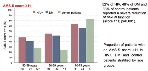 505 Männer wurden bei Baseline gebeten, den AMS-Fragebogen (Aging Male Symptoms Scale) auszufüllen. Eine Gesamtpunktzahl von 37 oder mehr repräsentiert ernste (subjektiv wahrgenommene) Probleme im psychologischen, somatischen und sexuellen Bereich. 50% der HIV-Patienten und 45% der Diabetes-Patienten hatten einen Score von 37 oder mehr, 28% der Kontrollgruppe. Bei den Fragen, die sich nur auf sexuelle Symptome beziehen, waren nur die HIV-Infektion und ein höheres Alter von 70-79 Jahren signifikant assoziiert mit einem schlechteren Score (11 Punkte oder mehr).