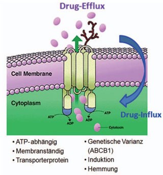P-Glykoprotein ist ein Membranständiges Transportprotein, welches ATP-abhängig Toxine oder auch Arzneistoffe, die von der Zelle als Toxine angesehen werden, nach dem Eindringen ins Zielgewebe aktiv aus diesem wieder ausschleust, d.h. einer therapeutischen Wirkung entgegen arbeitet. Die P-Glykoprotein-Expression wird über das MDR-1 Gen codiert, welches eine bedeutende genetische Varianz in Patienten aufweist. Die neue Nomenklatur der Proteine weist P-Glykoprotein als Mitglied der ABC-Transporter-Familie aus (ABCB1).