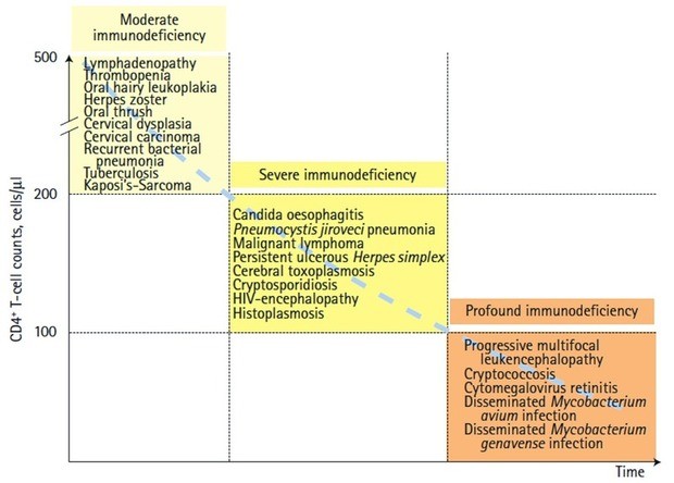 Abb. 1 Risk of opportunistic diseases according to CD4+ T-cell counts