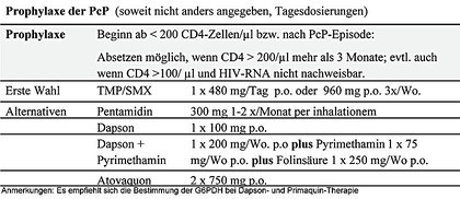 Empfohlen werden eine Primär-, aber auch eine Sekundärprophylaxe für Patienten mit <200 CD4-Zellen/µl (oder <14% der Gesamtlymphozytenzahl). Bevorzugt wird Trimethoprim-Sulfamethoxazol (TMP/SMX), das auch einen protektiven Effekt gegen Toxoplasmen hat.5,6 Die Gabe kann täglich oder dreimal wöchentlich erfolgen.7