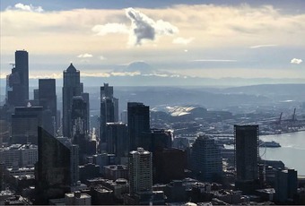 Blick von der Space Needle auf Seattle. Im Hintergrund der Mount Rainier