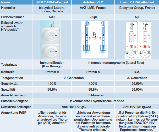 Daher ist es nicht zu vernachlässigen, dass bei HIV-Selbsttesten auch der Patient „selbst“ die korrekte Indikation (letzter HIV-Risikokontakt vor mehr als drei Monaten) und vor allem Kontraindikationen des verwendeten HIV-Selbsttests kennt. Für den Erhalt eines korrekten Testergebnisses ist zu beachten, einen HIV-Selbsttest nicht unter antiretroviraler Therapie zu verwenden. Bemerkenswerterweise wird nur vom Hersteller des Exacto® HIV-Selbsttest in diesem Zusammenhang explizit auch die Präexpositionsprophylaxe (PrEP) genannt.