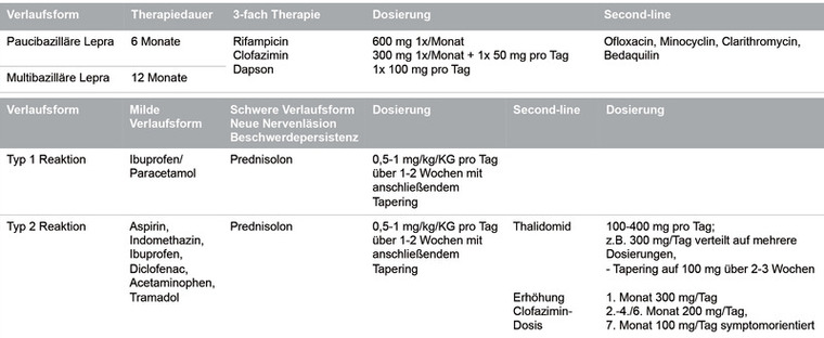 Die WHO-Leitlinie empfiehlt als Standard eine Triplebehandlung bestehend aus Rifampicin, Clofazimin sowie Dapson.6 Eine paucibazilläre Lepra sollte 6 Monate, eine multibazilläre Lepra mindestens 12 Monate behandelt werden.7 Bei Unverträglichkeit oder Resistenz gegenüber einem oder mehreren der drei Standardtherapeutika kann alternativ auch Ofloxacin, Minocyclin, Clarithromycin oder Bedaquilin verwendet werden (Tab. 1).