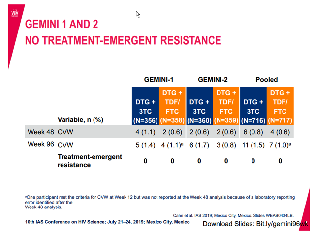 Die 96-Wochen-Daten der Studien GEMINI 1 und 2 belegen die Stabilität von Dolutegravir/3TC auch über längere Zeit. Unter dem 2DR-Regime im Vergleich zu Dolutegravir+F/TDF waren nach 48 und 96 Wochen gleich viele Patienten unter der Nachweisgrenze inklusive Patienten mit initial hoher Virämie >100.000 Kopien/ml. Ein virologisches Versagen im Lauf der zwei Jahre wurde unter 2DR bei 6 unter der Tripletherapie bei 4 Patienten beobachtet. In keinem Fall kam es zu einer Resistenzentwicklung. Arzneimittel-assoziierte Nebenwirkungen waren unter 2DR seltener (20% vs 25%).